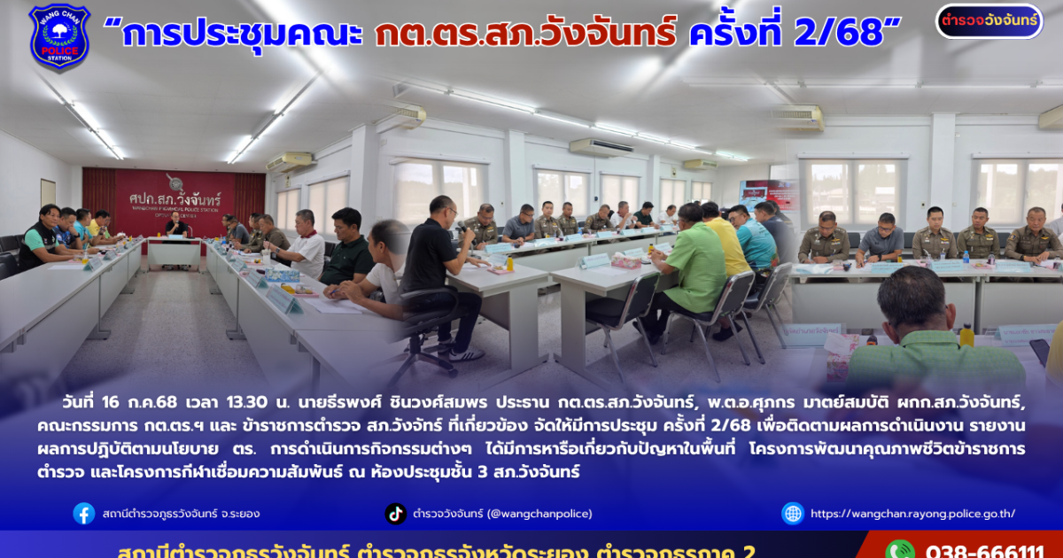 วันที่ 16 ก.ค.68 เวลา 13.30 น. นายธีรพงศ์ ชินวงศ์สมพร ประธาน กต.ตร.สภ.วังจันทร์, พ.ต.อ.ศุภกร มาตย์สมบัติ ผกก.สภ.วังจันทร์, คณะกรรมการ กต.ตร.ฯ และ ข้าราชการตำรวจ สภ.วังจัทร์ ที่เกี่ยวข้อง จัดให้มีการประชุม ครั้งที่ 2/68 เพื่อติดตามผลการดำเนินงาน รายงานผลการปฏิบัติตามนโยบาย ตร. การดำเนินการกิจกรรมต่างๆ ได้มีการหารือเกี่ยวกับปัญหาในพื้นที่ โครงการพัฒนาคุณภาพชีวิตข้าราชการตำรวจ และโครงการกีฬาเชื่อมความสัมพันธ์ ณ ห้องประชุมชั้น 3 สภ.วังจันทร์
