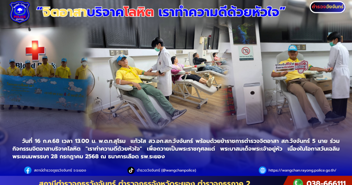 วันที่ 16 ก.ค.68 เวลา 13.00 น. พ.ต.ท.สุโรม แก้วใส สว.อก.สภ.วังจันทร์ พร้อมด้วยข้าราชการตำรวจจิตอาสา สภ.วังจันทร์ 5 นาย ร่วมกิจกรรมจิตอาสาบริจาคโลหิต “เราทำความดีด้วยหัวใจ” เพื่อถวายเป็นพระราชกุศลแด่ พระบาสมเด็จพระเจ้าอยู่หัว เนื่องในโอกาสวันเฉลิมพระชนมพรรษา 28 กรกฎาคม 2568 ณ ธนาคารเลือด รพ.ระยอง