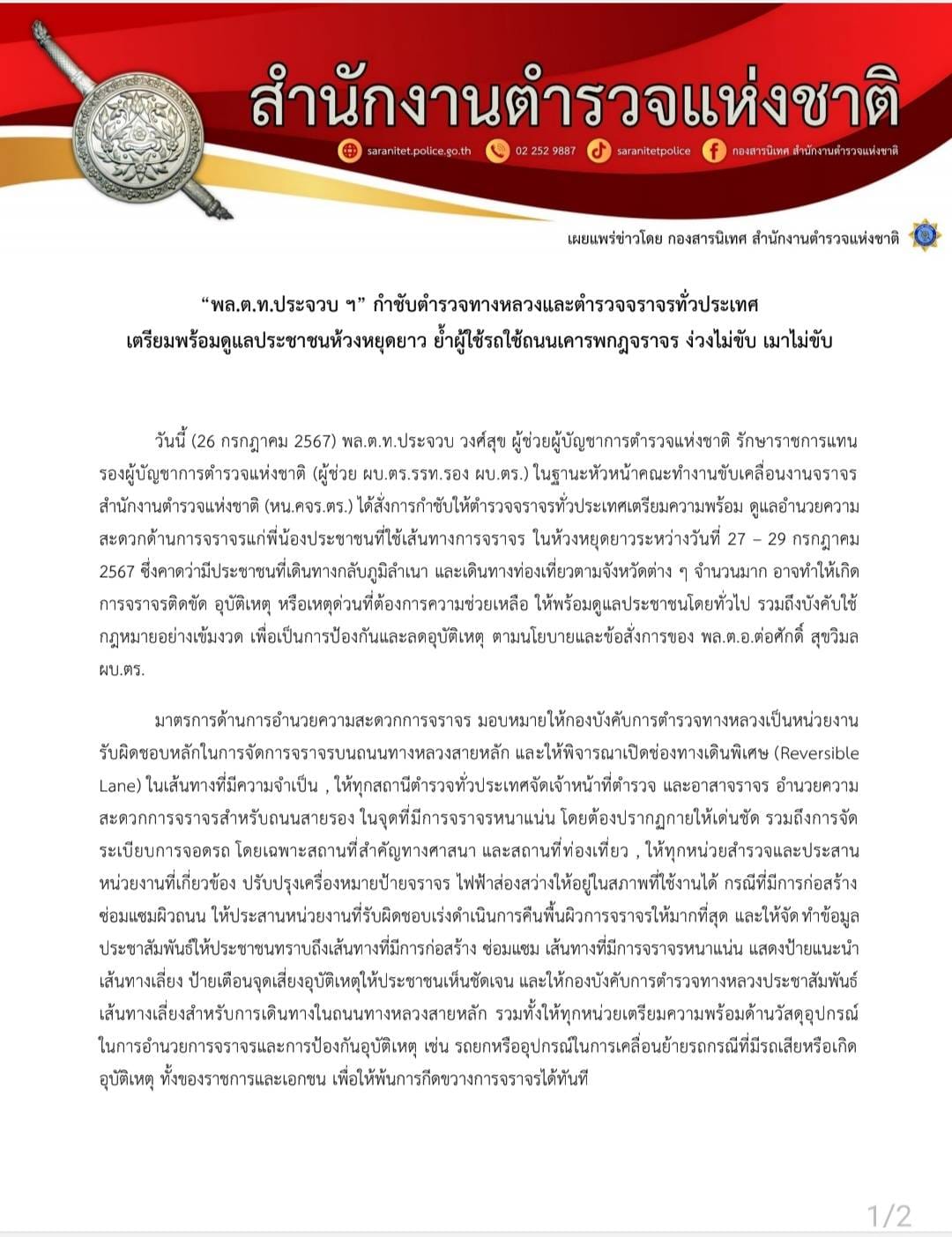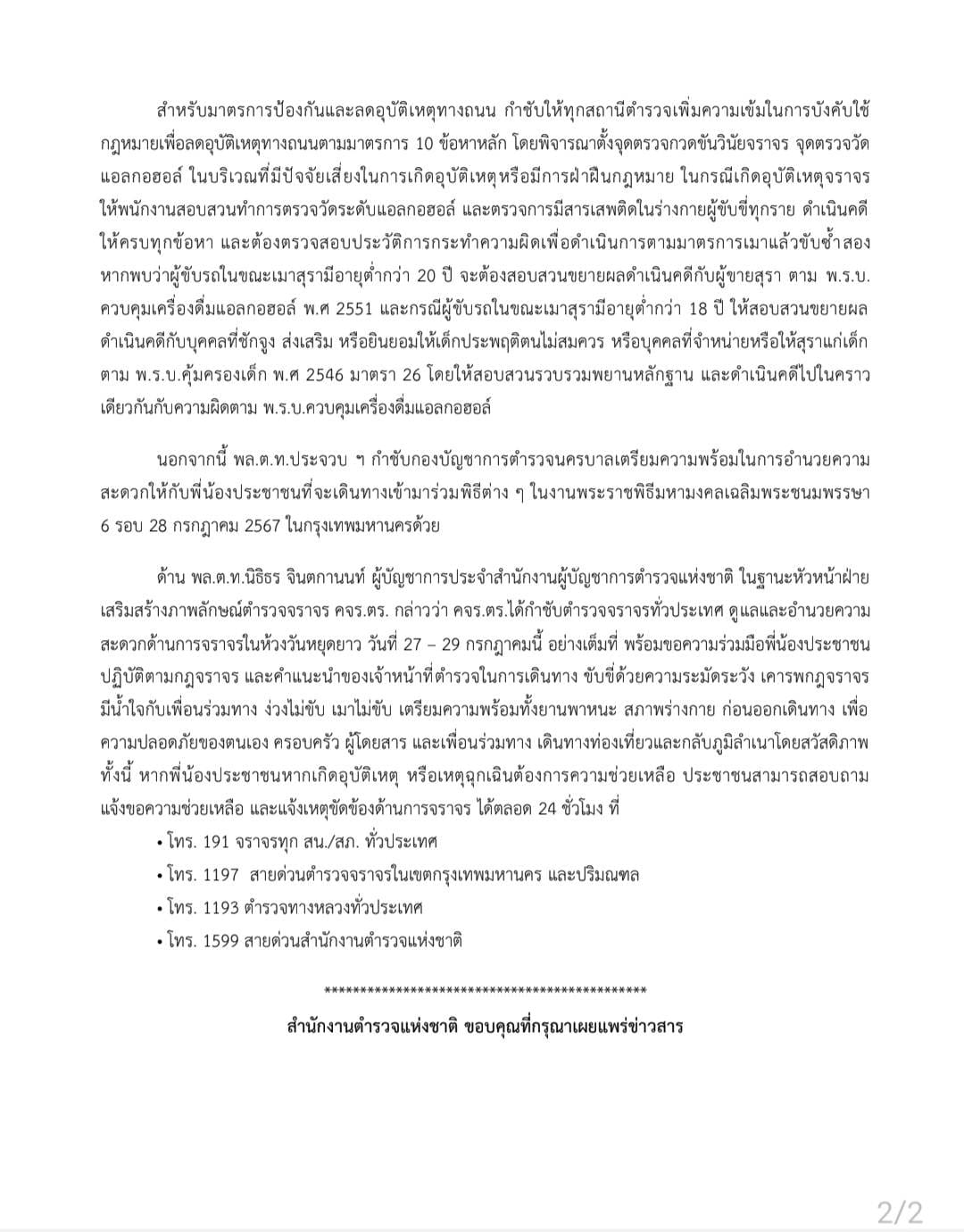 ด้าน พล.ต.ท.นิธิธร จินตกานนท์ ผู้บัญชาการประจำสำนักงานผู้บัญชาการตำรวจแห่งชาติ ในฐานะหัวหน้าฝ่ายเสริมสร้างภาพลักษณ์ตำรวจจราจร คจร.ตร. กล่าวว่า คจร.ตร.ได้กำชับตำรวจจราจรทั่วประเทศ ดูแลและอำนวยความสะดวกด้านการจราจรในห้วงวันหยุดยาว วันที่ 27 – 29 กรกฎาคมนี้ อย่างเต็มที่ พร้อมขอความร่วมมือพี่น้องประชาชนปฏิบัติตามกฎจราจร และคำแนะนำของเจ้าหน้าที่ตำรวจในการเดินทาง ขับขี่ด้วยความระมัดระวัง เคารพกฎจราจร มีน้ำใจกับเพื่อนร่วมทาง ง่วงไม่ขับ เมาไม่ขับ เตรียมความพร้อมทั้งยานพาหนะ สภาพร่างกาย ก่อนออกเดินทาง เพื่อความปลอดภัยของตนเอง ครอบครัว ผู้โดยสาร และเพื่อนร่วมทาง เดินทางท่องเที่ยวและกลับภูมิลำเนาโดยสวัสดิภาพ ทั้งนี้ หากพี่น้องประชาชนหากเกิดอุบัติเหตุ หรือเหตุฉุกเฉินต้องการความช่วยเหลือ ประชาชนสามารถสอบถาม แจ้งขอความช่วยเหลือ และแจ้งเหตุขัดข้องด้านการจราจร ได้ตลอด 24 ชั่วโมง ที่
