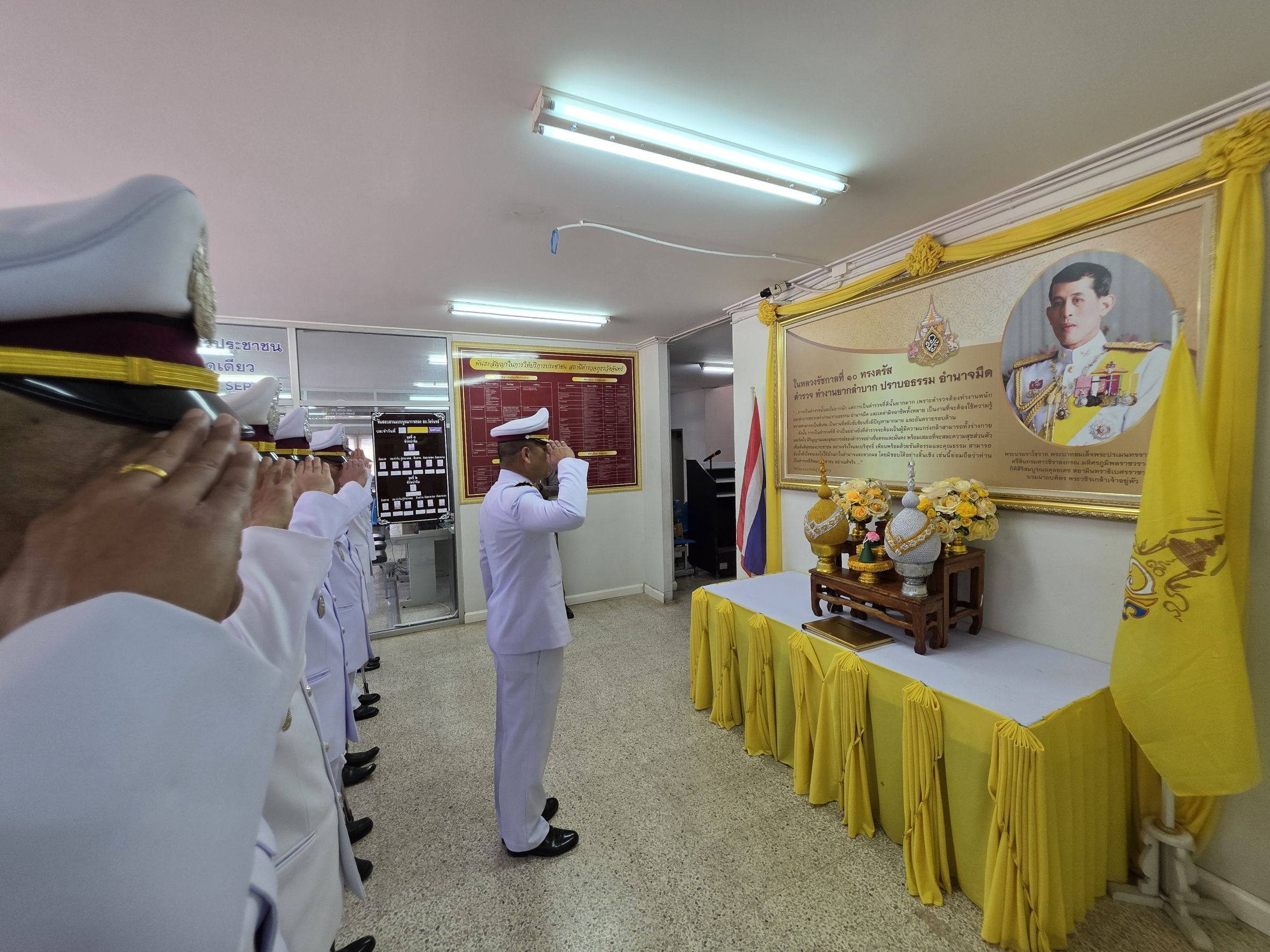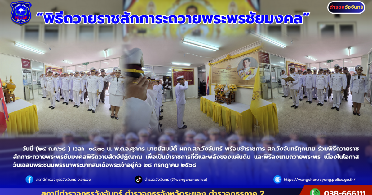 วันนี้ (๒๔ ก.ค.๖๘ ) เวลา ๐๘.๓๐ น. พ.ต.อ.ศุภกร มาตย์สมบัติ์ ผกก.สภ.วังจันทร์ พร้อมข้าราชการ สภ.วังจันทร์ทุกนาย ร่วมพิธีถวายราชสักการะถวายพระพรชัยมงคลพิธีถวายสัตย์ปฏิญาณ เพื่อเป็นข้าราชการที่ดีและพลังของแผ่นดิน และพิธีลงนามถวายพระพร เนื่องในโอกาสวันเฉลิมพระชนมพรรษาพระบาทสมเด็จพระเจ้าอยู่หัว ๒๘ กรกฎาคม ๒๕๖๘ ณ สถานีตำรวจภูธรวังจันทร์ ภ.จว.ระยอง