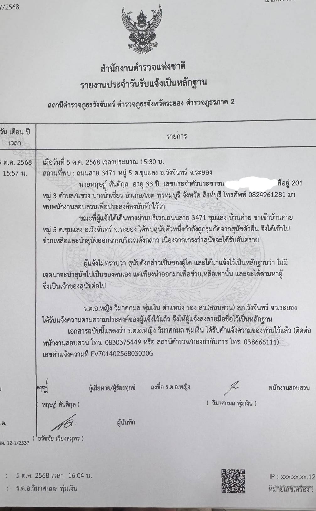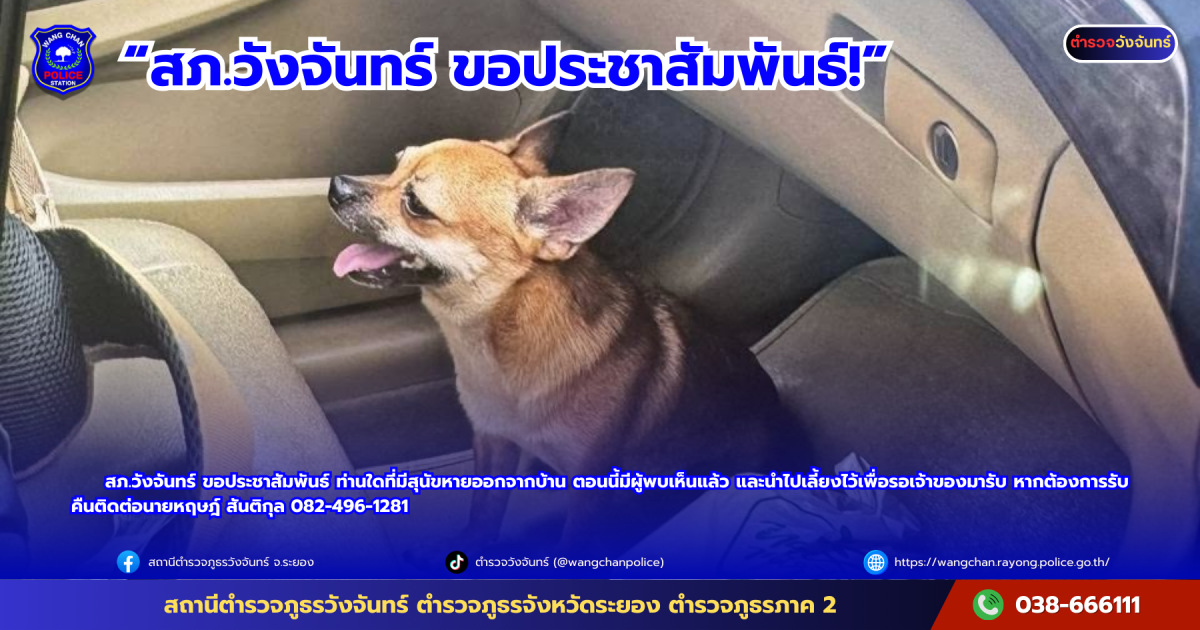 สภ.วังจันทร์ ขอประชาสัมพันธ์! 5 ตุลาคม 2568 โดย admin / ข่าวประชาสัมพันธ์,ข่าวประชาสัมพันธ์,ข่าวฝากประชาสัมพันธ์ สภ.วังจันทร์ ขอประชาสัมพันธ์ ท่านใดที่มีสุนัขหายออกจากบ้าน ตอนนี้มีผู้พบเห็นแล้ว และนำไปเลี้ยงไว้เพื่อรอเจ้าของมารับ หากต้องการรับคืนติดต่อนายหฤษฎ์ สันติกุล082-496-1281 FacebookFacebookXXLINELine