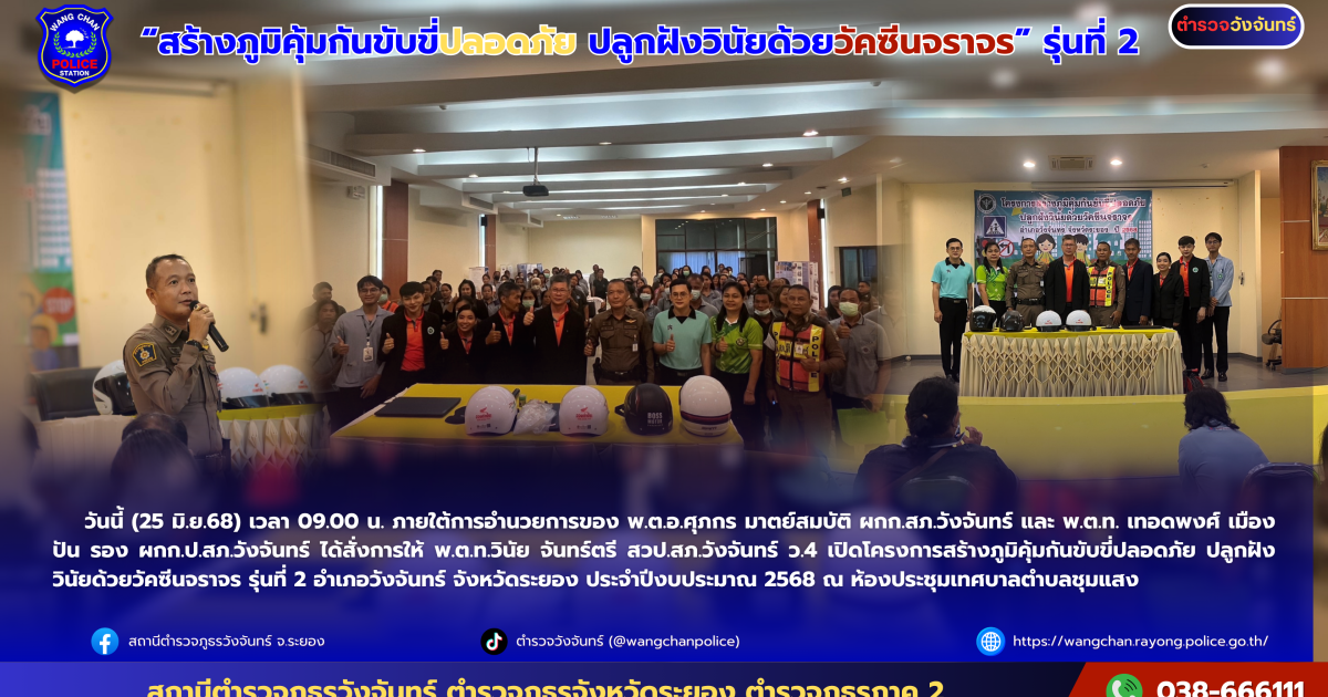 วันที่ 25 มิ.ย.68 เวลา 09.00 น. ภายใต้การอำนวยการของ พ.ต.อ.ศุภกร มาตย์สมบัติ ผกก.สภ.วังจันทร์ และ พ.ต.ท. เทอดพงศ์ เมืองปัน รอง ผกก.ป.สภ.วังจันทร์ ได้สั่งการให้ พ.ต.ท.วินัย จันทร์ตรี สวป.สภ.วังจันทร์ ว.4 เปิดโครงการสร้างภูมิคุ้มกันขับขี่ปลอดภัย ปลูกฝังวินัยด้วยวัคซีนจราจร รุ่นที่ 2 อำเภอวังจันทร์ จังหวัดระยอง ประจำปีงบประมาณ 2568 ณ ห้องประชุมเทศบาลตำบลชุมแสง