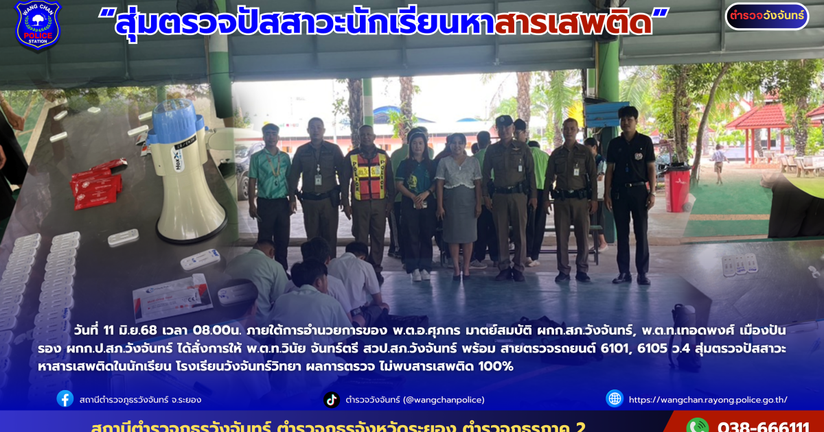 วันที่ 11 มิ.ย.68 เวลา 08.00น. ภายใต้การอำนวยการของ พ.ต.อ.ศุภกร มาตย์สมบัติ ผกก.สภ.วังจันทร์, พ.ต.ท.เทอดพงศ์ เมืองปัน รอง ผกก.ป.สภ.วังจันทร์ ได้สั่งการให้ พ.ต.ท.วินัย จันทร์ตรี สวป.สภ.วังจันทร์ พร้อม สายตรวจรถยนต์ 6101, 6105 ว.4 สุ่มตรวจปัสสาวะหาสารเสพติดในนักเรียน โรงเรียนวังจันทร์วิทยา ผลการตรวจ ไม่พบสารเสพติด 100%