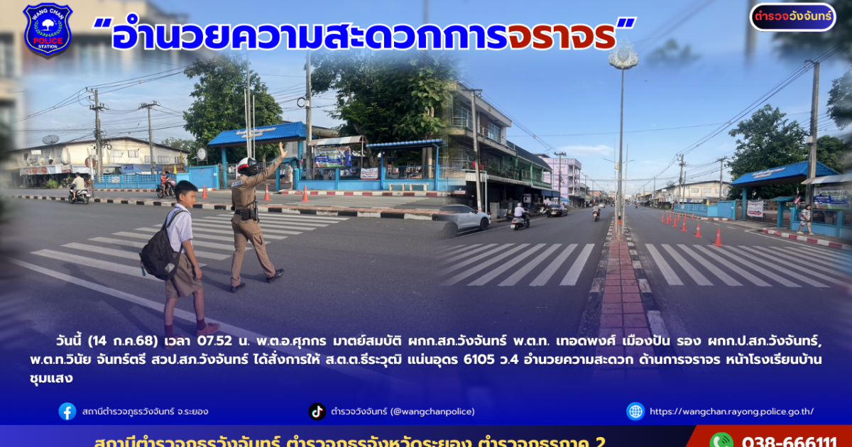 วันนี้ (14 ก.ค.68) เวลา 07.52 น. พ.ต.อ.ศุภกร มาตย์สมบัติ ผกก.สภ.วังจันทร์ พ.ต.ท. เทอดพงศ์ เมืองปัน รอง ผกก.ป.สภ.วังจันทร์, พ.ต.ท.วินัย จันทร์ตรี สวป.สภ.วังจันทร์ ได้สั่งการให้ ส.ต.ต.ธีระวุฒิ แน่นอุดร 6105 ว.4 อำนวยความสะดวก ด้านการจราจร หน้าโรงเรียนบ้านชุมแสง