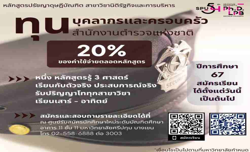 รับส่วนลด 20% ของค่าใช้จ่ายตลอดหลักสูตร เพียงสมัครและลงทะเบียนเรียนปริญญาเอก ม.ศรีปทุม หลักสูตรปรัชญาดุษฎีบัณฑิต สาขาวิชานิติรัฐกิจและการบริหาร Ph.D. (Public and Business Administration Jurisprudence)
