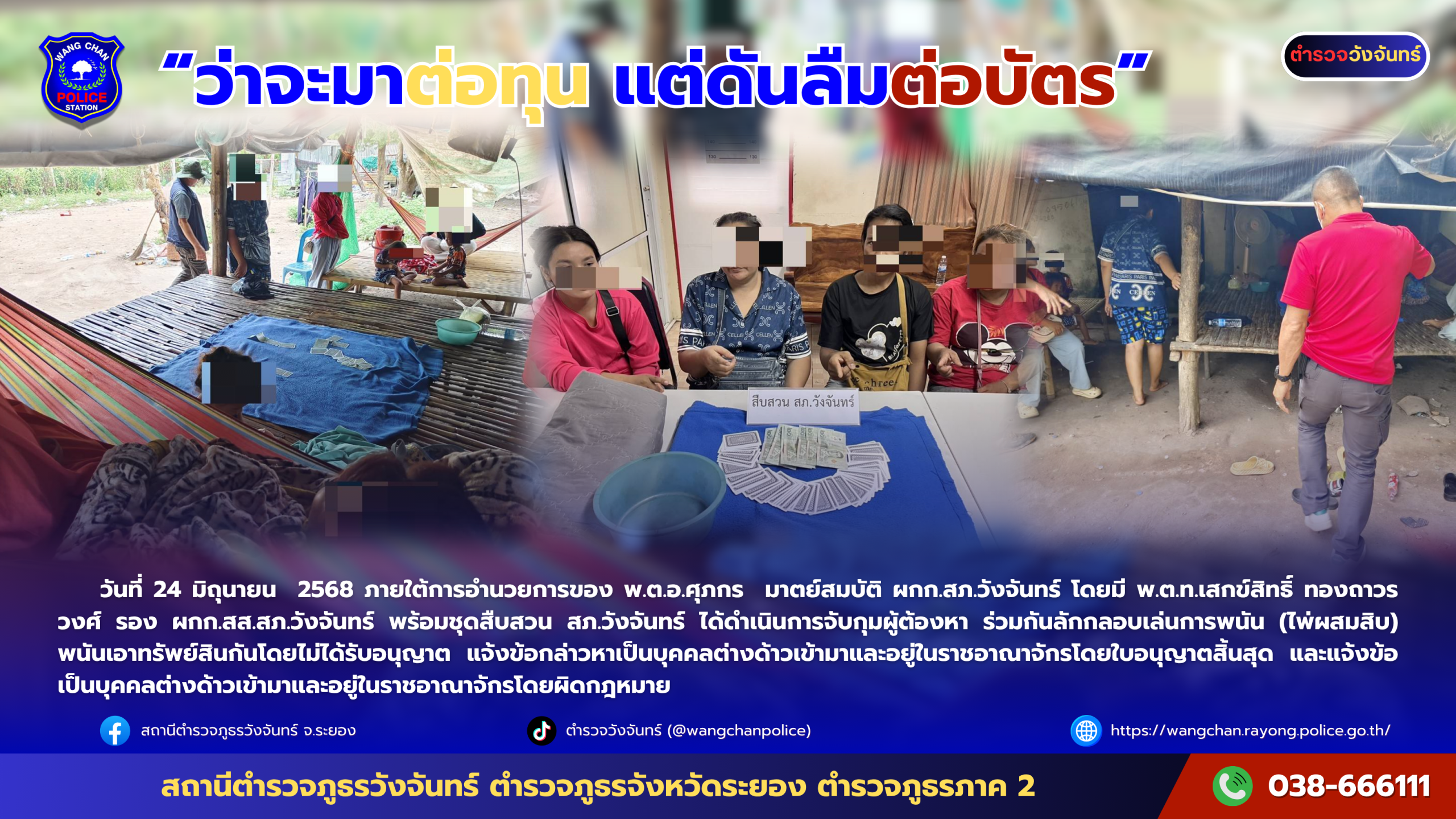 เมื่อวันที่ 24 มิ.ย.68 ภายใต้การอำนวยการของ พ.ต.อ.ศุภกร มาตย์สมบัติ ผกก.สภ.วังจันทร์ โดยมี พ.ต.ท.เสกข์สิทธิ์ ทองถาวรวงศ์ รอง ผกก.สส.สภ.วังจันทร์ พร้อมชุดสืบสวน สภ.วังจันทร์