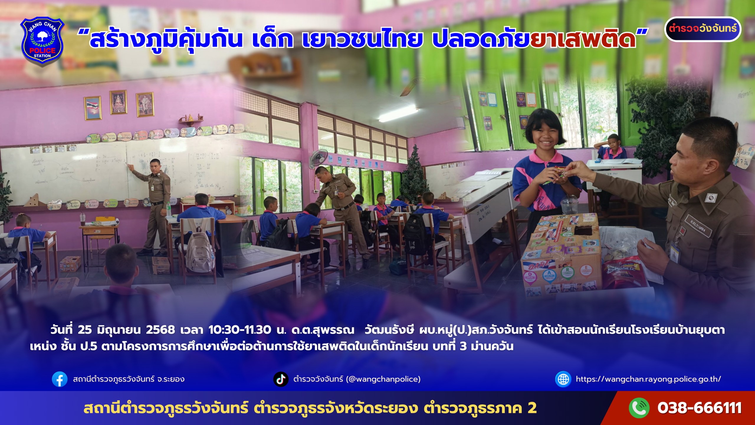 วันที่ 25 มิถุนายน 2568 เวลา 10:30-11.30 น. ด.ต.สุพรรณ วัฒนรังษี ผบ.หมู่(ป.)สภ.วังจันทร์ ได้เข้าสอนนักเรียนโรงเรียนบ้านยุบตาเหน่ง ชั้น ป.5