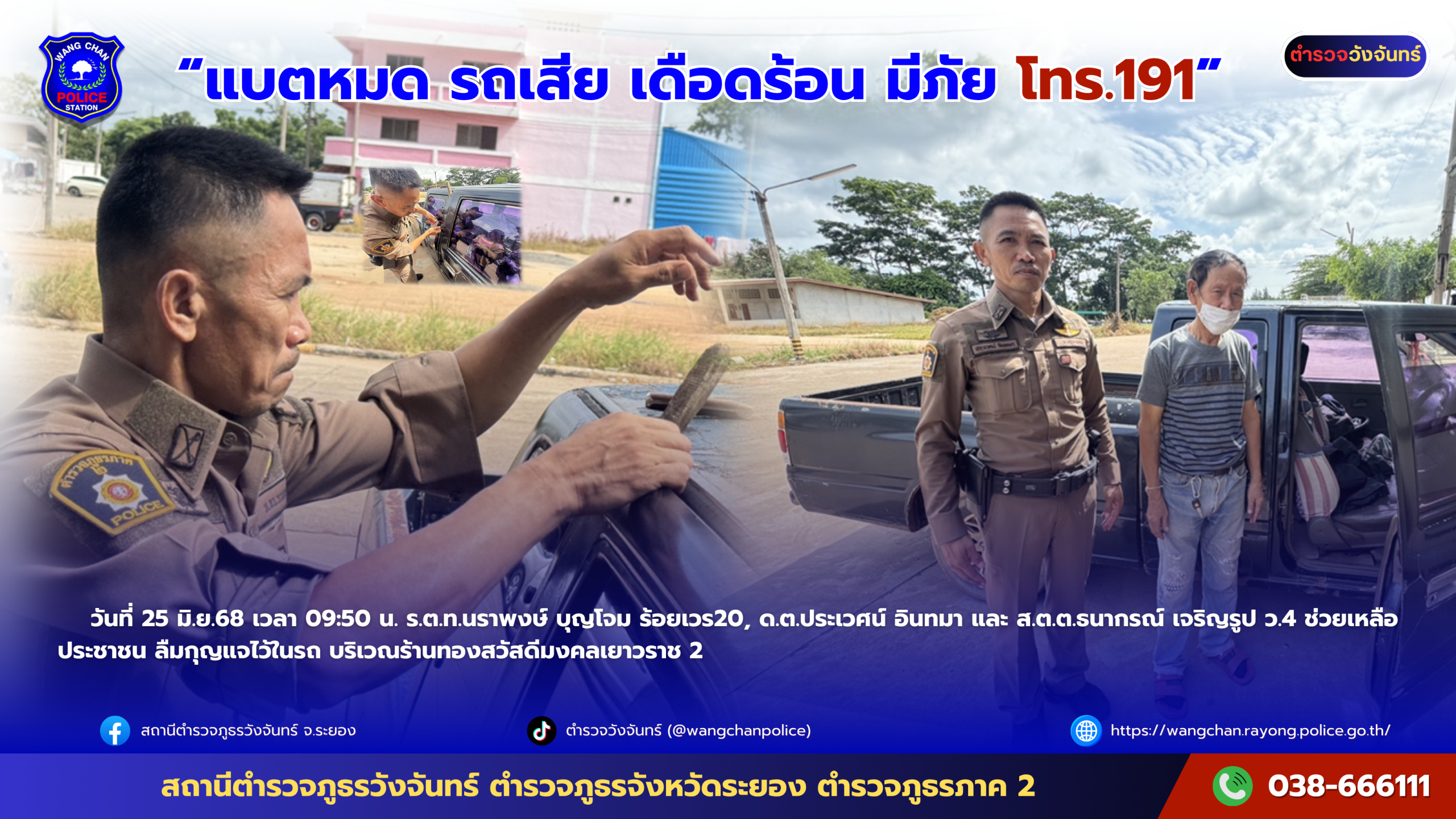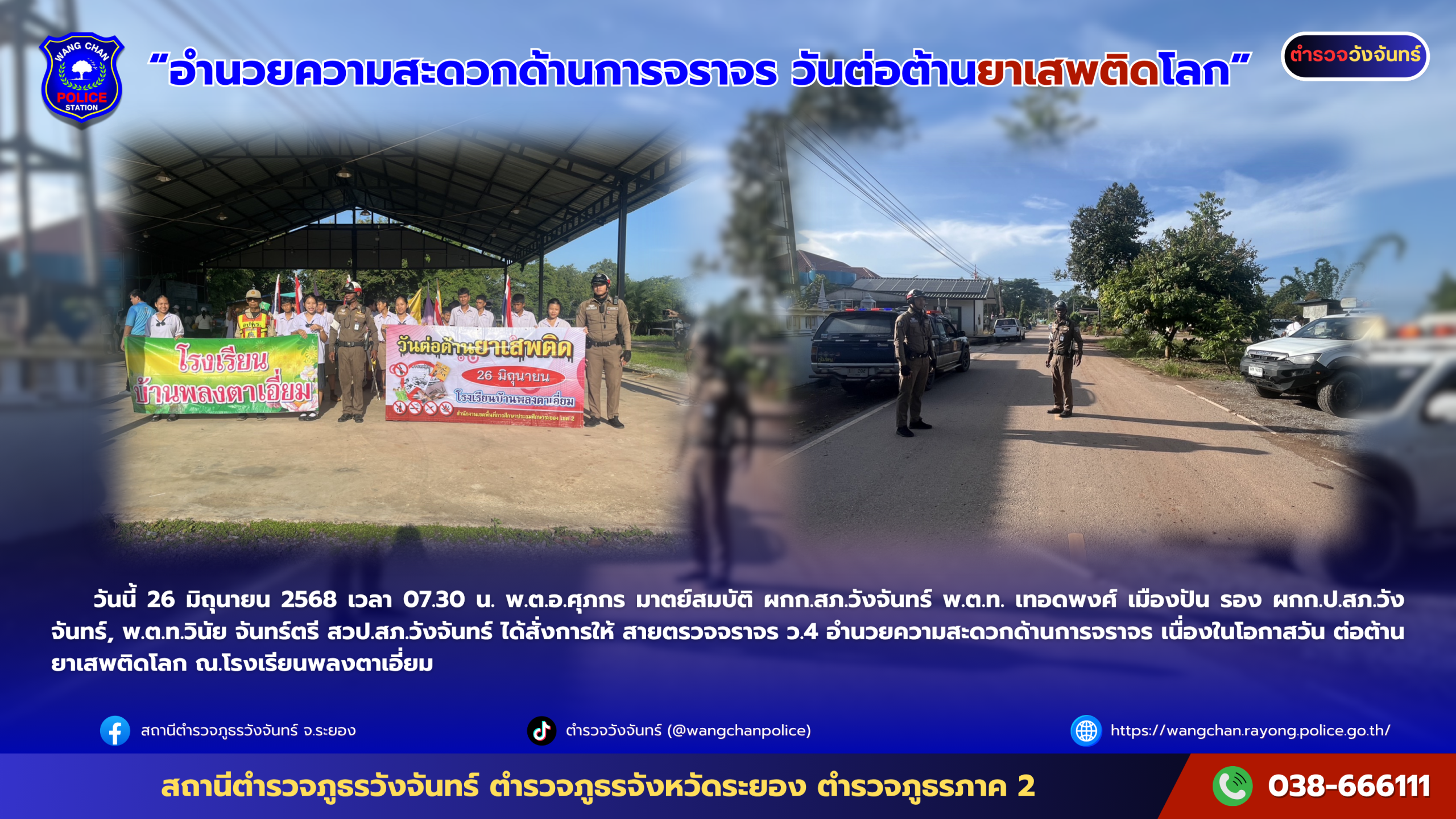 วันที่ 26 มิ.ย.68 เวลา 15.30 น. ภายใต้การอำนวยการของ พ.ต.อ.ศุภกร มาตย์สมบัติ ผกก.สภ.วังจันทร์, พ.ต.ท.เทอดพงศ์ เมืองปัน รอง ผกก.ป.สภ.วังจันทร์ ได้มอบหมายให้