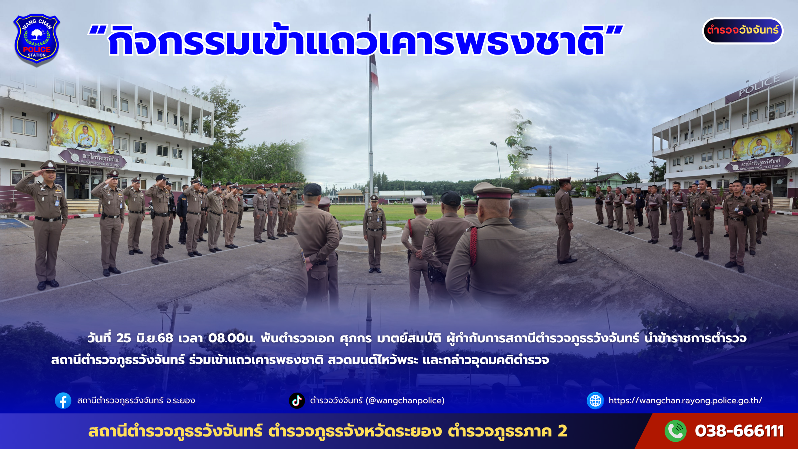 วันที่ 25 มิ.ย.68 เวลา 08.00น. พันตำรวจเอก ศุภกร มาตย์สมบัติ ผู้กำกับการสถานีตำรวจภูธรวังจันทร์ นำข้าราชการตำรวจสถานีตำรวจภูธรวังจันทร์
