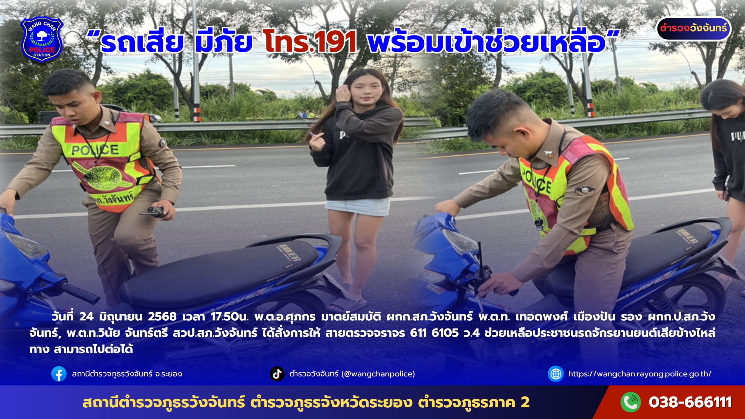 เมื่อวันที่ 24 มิ.ย.68 เวลา 17.50น. พ.ต.อ.ศุภกร มาตย์สมบัติ ผกก.สภ.วังจันทร์ พ.ต.ท. เทอดพงศ์ เมืองปัน รอง ผกก.ป.สภ.วังจันทร์, พ.ต.ท.วินัย จันทร์ตรี สวป.สภ.วังจันทร์ ได้สั่งการให้