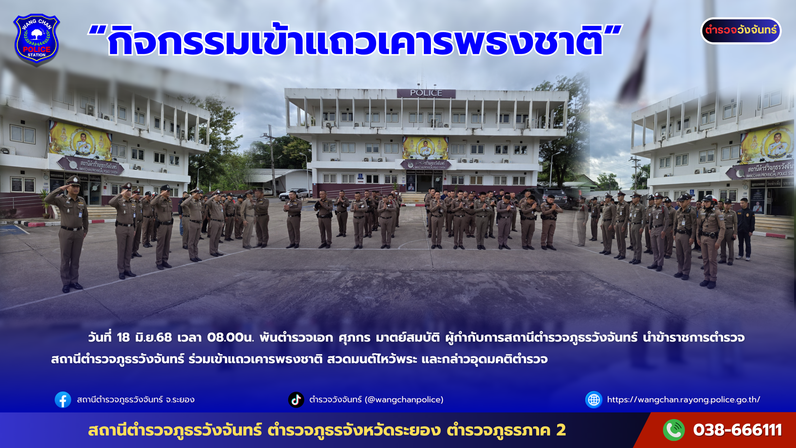 วันที่ 18 มิ.ย.68 เวลา 08.00น. พันตำรวจเอก ศุภกร มาตย์สมบัติ ผู้กำกับการสถานีตำรวจภูธรวังจันทร์ นำข้าราชการตำรวจสถานีตำรวจภูธรวังจันทร์