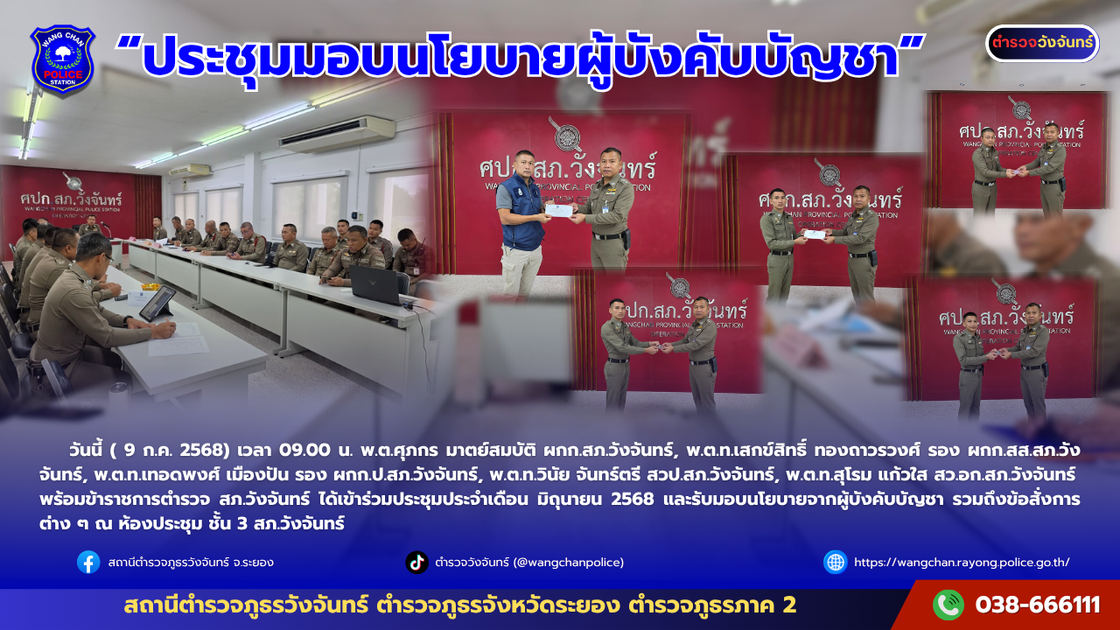 วันนี้ ( 9 ก.ค. 2568) เวลา 09.00 น. พ.ต.ศุภกร มาตย์สมบัติ ผกก.สภ.วังจันทร์, พ.ต.ท.เสกข์สิทธิ์ ทองถาวรวงศ์ รอง ผกก.สส.สภ.วังจันทร์,