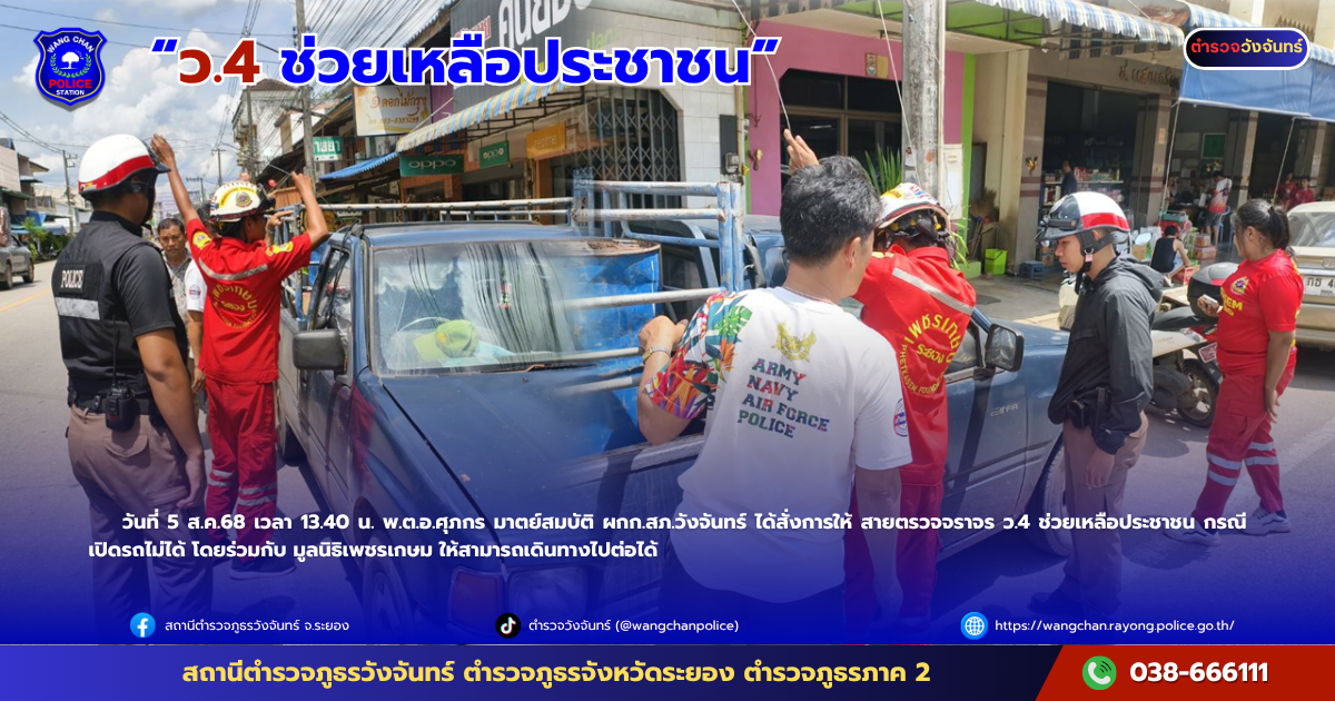 วันที่ 5 ส.ค.68 เวลา 13.40 น. พ.ต.อ.ศุภกร มาตย์สมบัติ ผกก.สภ.วังจันทร์ ได้สั่งการให้ สายตรวจจราจร ว.4 ช่วยเหลือประชาชน กรณีเปิดรถไม่ได้
