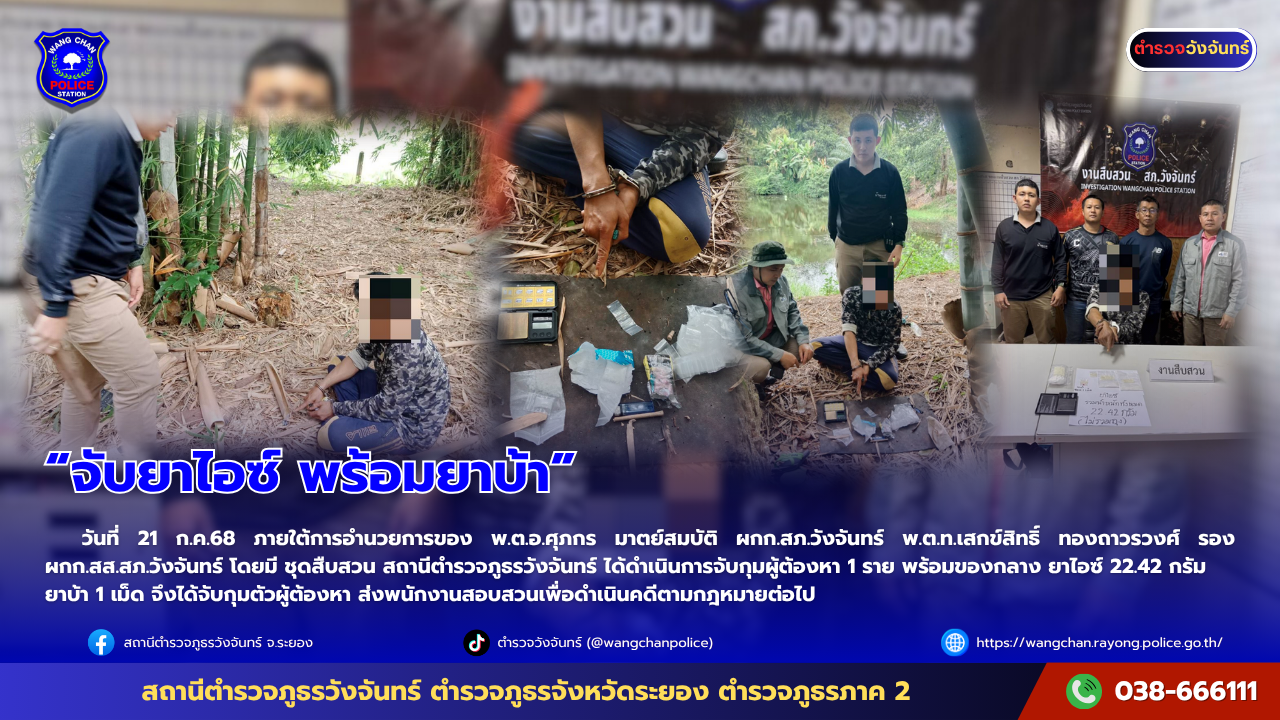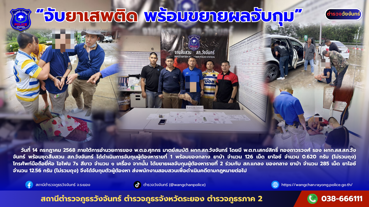 วันที่ 14 กรกฎาคม 2568 ภายใต้การอำนวยการของ พ.ต.อ.ศุภกร มาตย์สมบัติ ผกก.สภ.วังจันทร์ โดยมี พ.ต.ท.เสกข์สิทธิ์ ทองถาวรวงศ์ รอง ผกก.สส.สภ.วังจันทร์ พร้อมชุดสืบสวน สภ.วังจันทร์