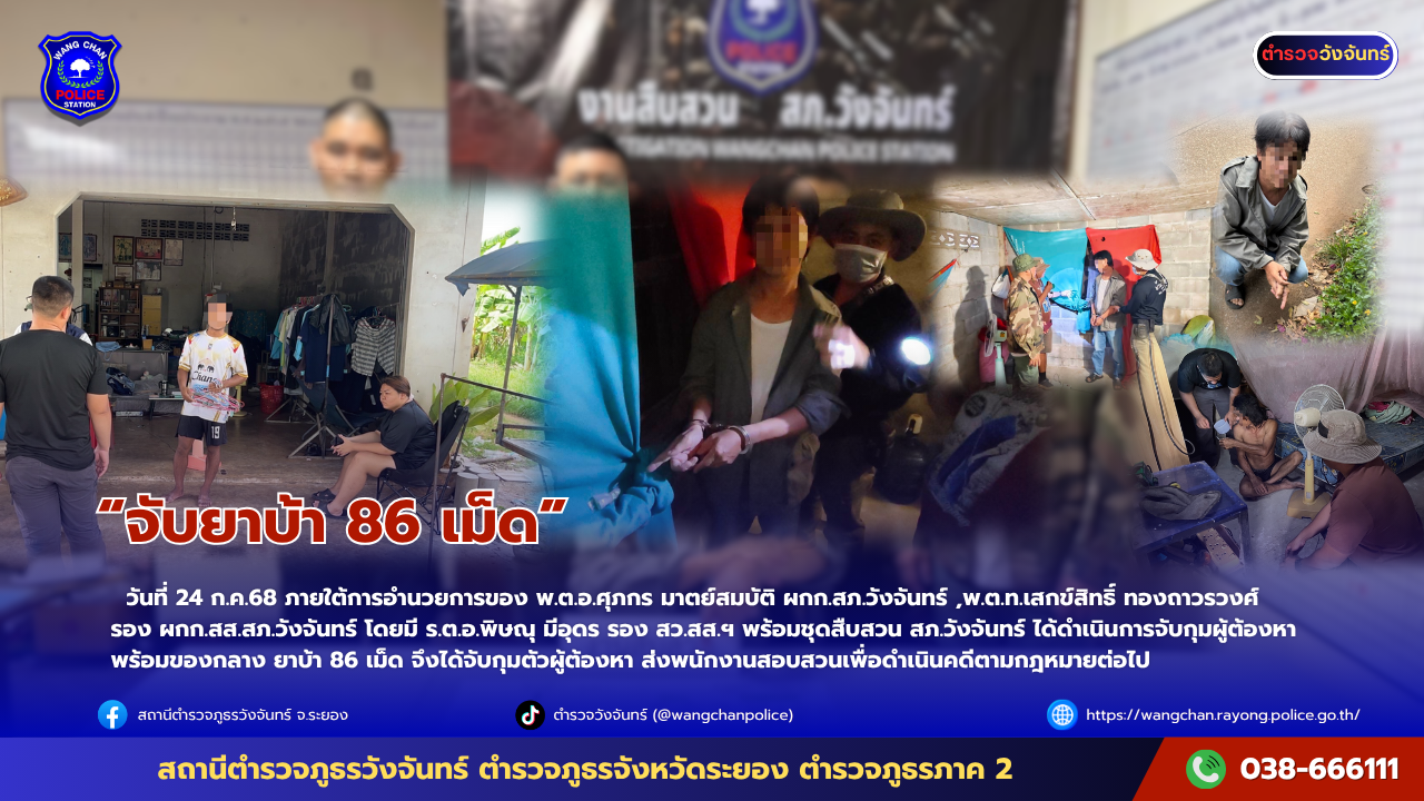 วันที่ 7 มกราคม 2569 ภายใต้การอำนวยการของ พ.ต.อ.ศุภกร มาตย์สมบัติ ผกก.สภ.วังจันทร์ โดยมี พ.ต.ท.เสกข์สิทธิ์ ทองถาวรวงศ์ รอง ผกก.สส.สภ.วังจันทร์ พร้อมชุดสืบสวน
