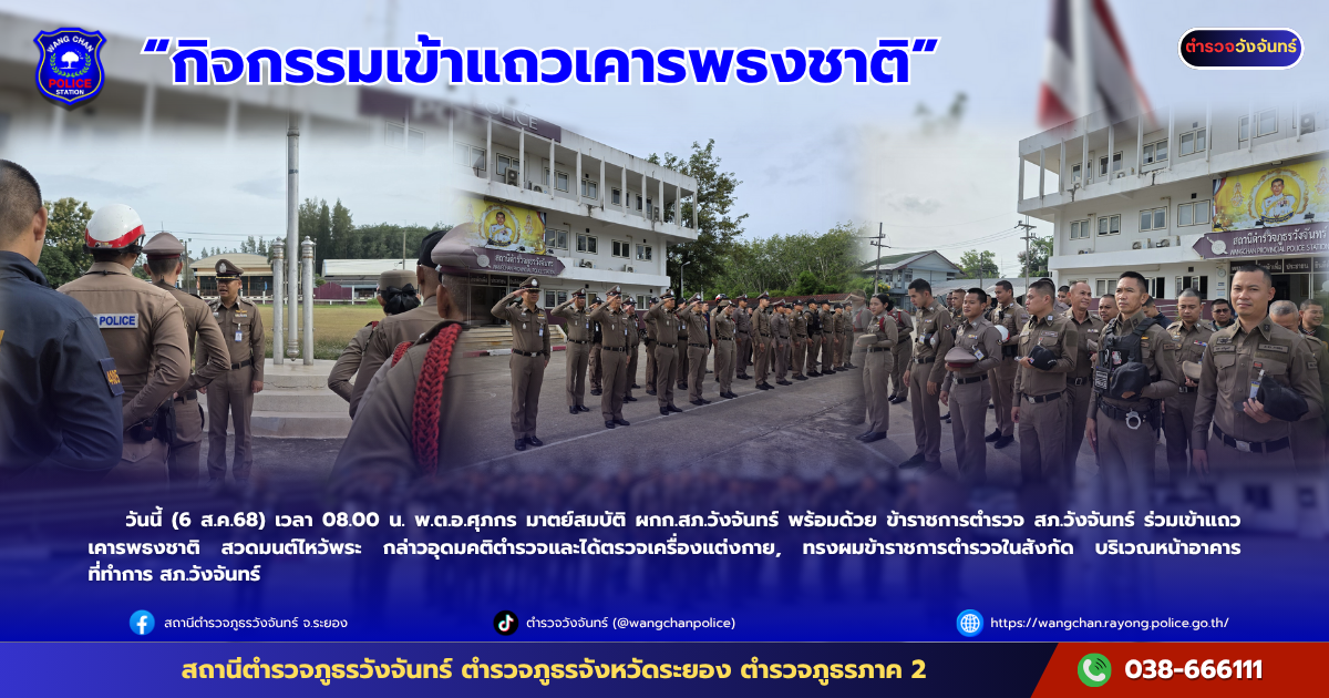 วันนี้ (6 ส.ค.68) เวลา 08.00 น. พ.ต.อ.ศุภกร มาตย์สมบัติ ผกก.สภ.วังจันทร์ พร้อมด้วย ข้าราชการตำรวจ สภ.วังจันทร์ ร่วมเข้าแถวเคารพธงชาติ สวดมนต์ไหว้พระ