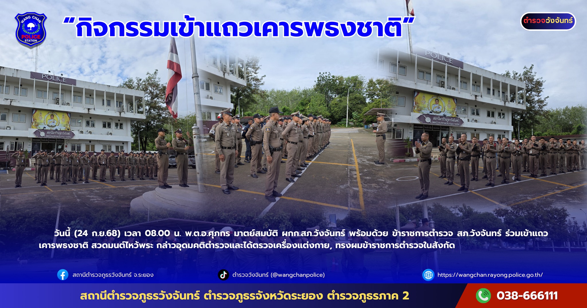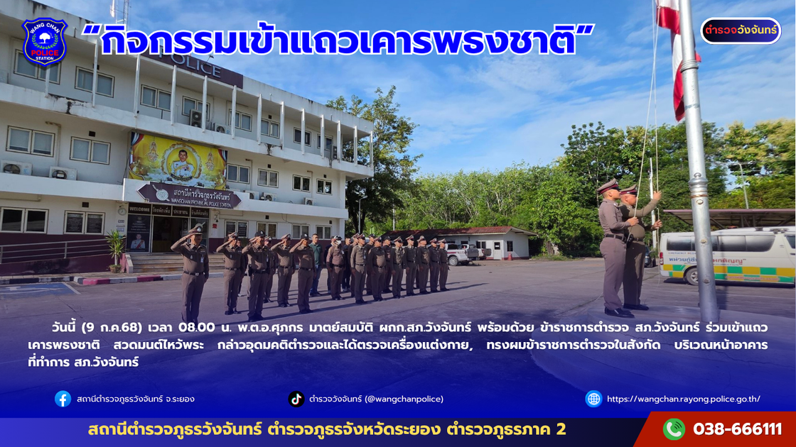 นนี้ (24 ก.ย.68) เวลา 08.00 น. พ.ต.อ.ศุภกร มาตย์สมบัติ ผกก.สภ.วังจันทร์ พร้อมด้วย ข้าราชการตำรวจ สภ.วังจันทร์ ร่วมเข้าแถวเคารพธงชาติ..