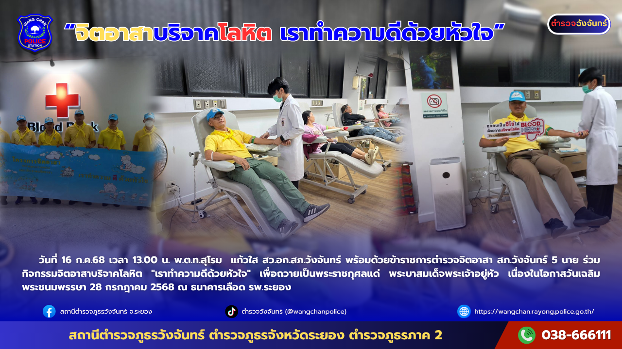 วันที่ 16 ก.ค.68 เวลา 13.00 น. พ.ต.ท.สุโรม แก้วใส สว.อก.สภ.วังจันทร์ พร้อมด้วยข้าราชการตำรวจจิตอาสา สภ.วังจันทร์ 5 นาย ร่วมกิจกรรมจิตอาสาบริจาคโลหิต “เราทำความดีด้วยหัวใจ”