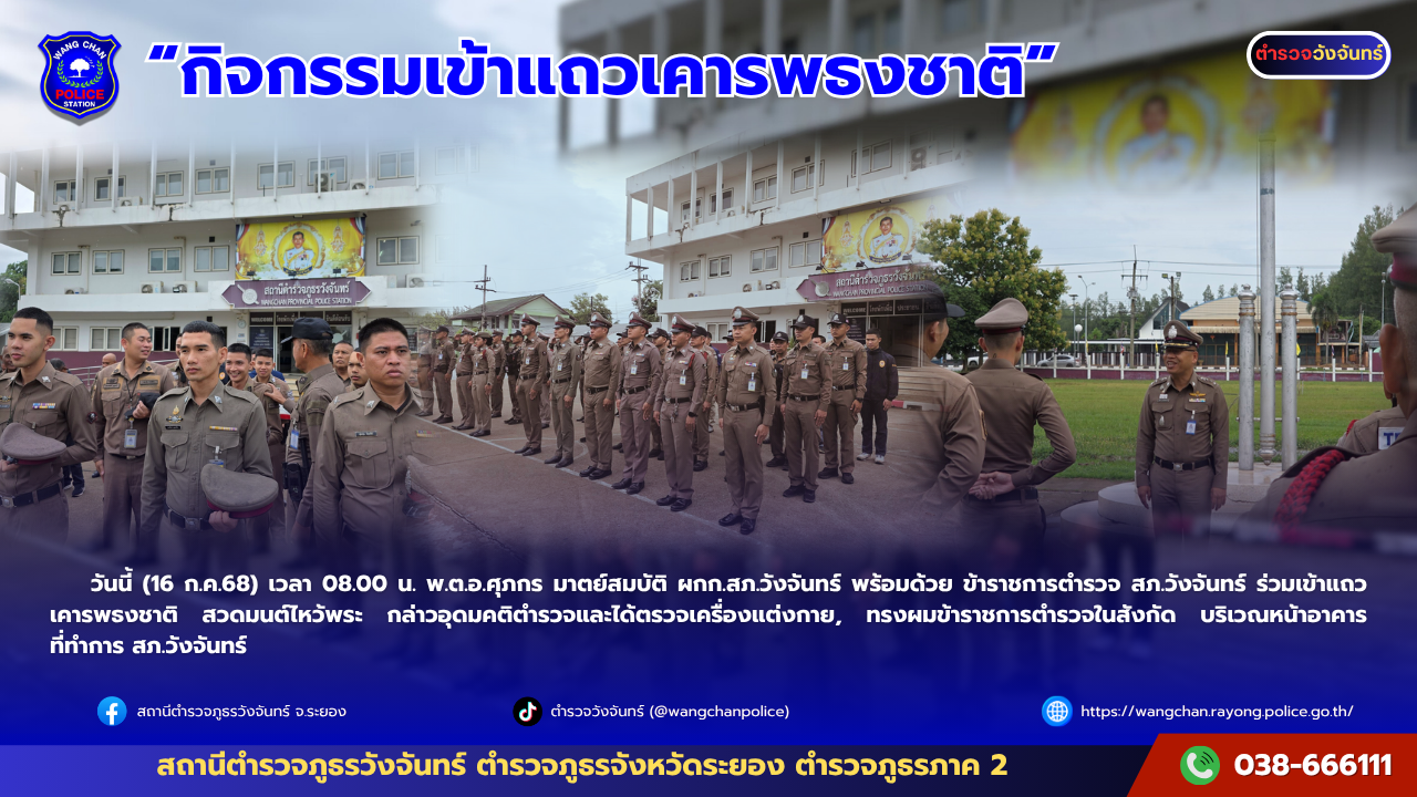 วันนี้ (16 ก.ค.68) เวลา 08.00 น. พ.ต.อ.ศุภกร มาตย์สมบัติ ผกก.สภ.วังจันทร์ พร้อมด้วย ข้าราชการตำรวจ สภ.วังจันทร์ ร่วมเข้าแถวเคารพธงชาติ สวดมนต์ไหว้พระ