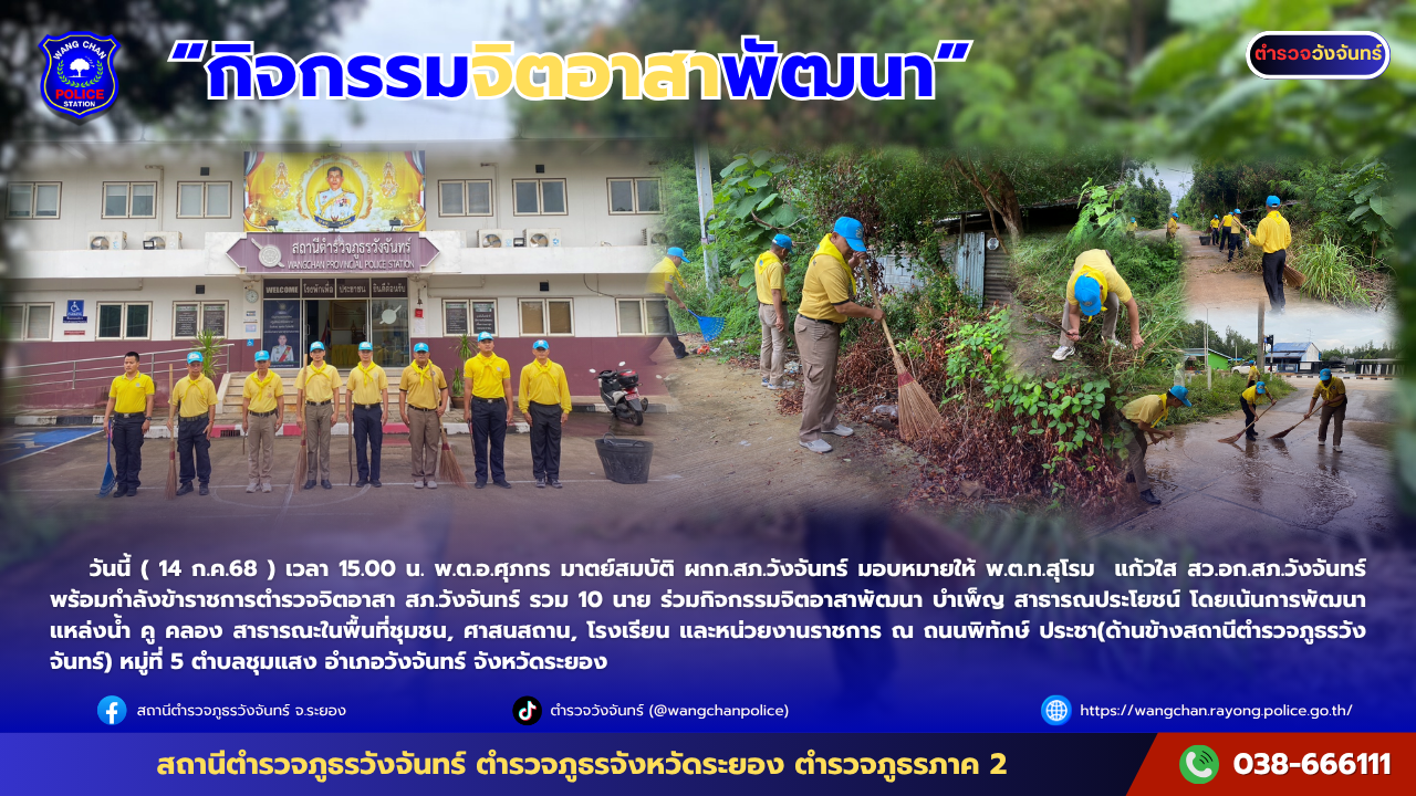 วันนี้ ( 14 ก.ค.68 ) เวลา 15.00 น. พ.ต.อ.ศุภกร มาตย์สมบัติ ผกก.สภ.วังจันทร์ มอบหมายให้ พ.ต.ท.สุโรม แก้วใส สว.อก.สภ.วังจันทร์ พร้อมกำลังข้าราชการตำรวจจิตอาสา สภ.วังจันทร์