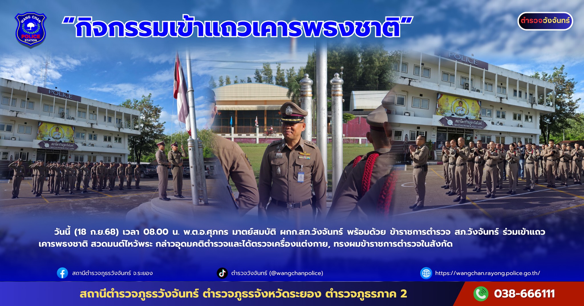 วันนี้ (18 ก.ย.68) เวลา 08.00 น. พ.ต.อ.ศุภกร มาตย์สมบัติ ผกก.สภ.วังจันทร์ พร้อมด้วย ข้าราชการตำรวจ สภ.วังจันทร์ ร่วมเข้าแถวเคารพธงชาติ …